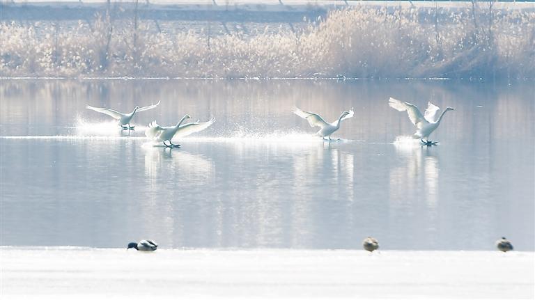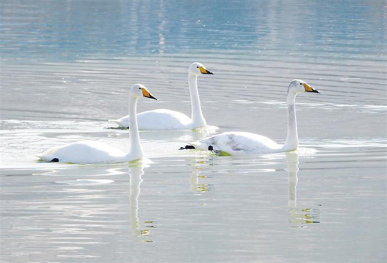 近日,永靖縣鹽鍋峽鎮(zhèn)境內(nèi)的黃河八盤峽水庫(kù)成為天鵝等候鳥(niǎo)越冬的樂(lè)園,它們?cè)诖藯?、覓食,成為冬日黃河里的一道靚麗風(fēng)景。 本報(bào)記者 史有東 攝