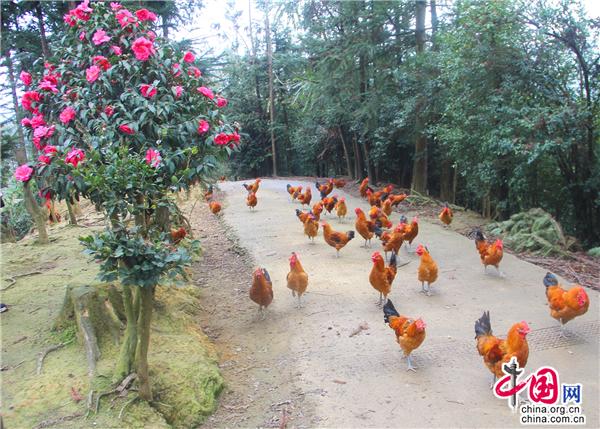 茶花具有“唯有山茶殊耐久,獨能深月占春風(fēng)”的傲梅風(fēng)骨,又有“花繁艷紅,深奪曉霞”的凌牡丹之鮮艷,因此自古以來就是極富盛名的木本花卉,在唐宋兩朝達到了登峰造極之境,直到十七世紀(jì)引入歐洲后,造成轟動,也因此獲得“世界名花”的美名。九龍街道牛街居委會小寨土雞生態(tài)產(chǎn)業(yè)園嬌艷的茶花給人一種神圣感,同時被賦予了一種原始的信仰:山茶是春天的神木,是春天的圣樹。置身九龍小寨土雞生態(tài)產(chǎn)業(yè)園,來一場與森林的浪漫邂逅,恍如仙境。園里有枇杷林、櫻桃林、楊梅林、梨樹林、紅豆杉林、柏樹林、椿樹林、油桃林、核桃林、灌木林以及草莓園、蔬菜園、山茶花園、荷花園,樹下是一群群羽毛鮮亮的土雞悠閑地覓食,好一幅田園風(fēng)景畫!