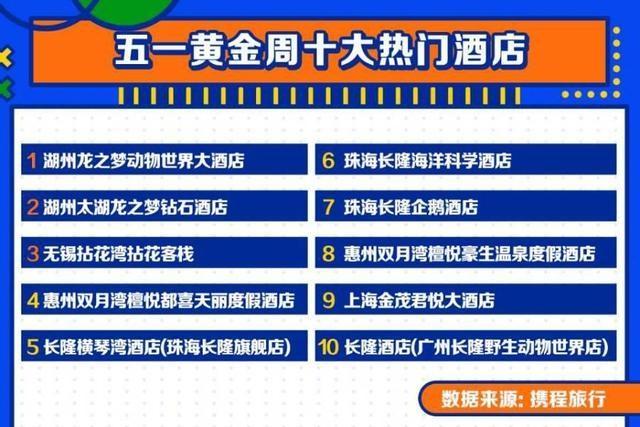 數(shù)據(jù)顯示,攜程酒店預(yù)訂間夜以及GMV在假期前三天連續(xù)突破平臺歷史峰值,對比2019年同期,單日訂單量增幅最高達(dá)70%。湖州龍之夢動(dòng)物世界大酒店、湖州太湖龍之夢鉆石酒店、無錫拈花灣拈花客棧、惠州雙月灣檀悅都喜天麗度假酒店、長隆橫琴灣酒店(珠海長隆旗艦店)、珠海長隆海洋科學(xué)酒店、珠海長隆企鵝酒店、惠州雙月灣檀悅豪生溫泉度假酒店、上海金茂君悅大酒店、長隆酒店(廣州長隆野生動(dòng)物世界店)為今年“五一”黃金周熱門酒店TOP10。