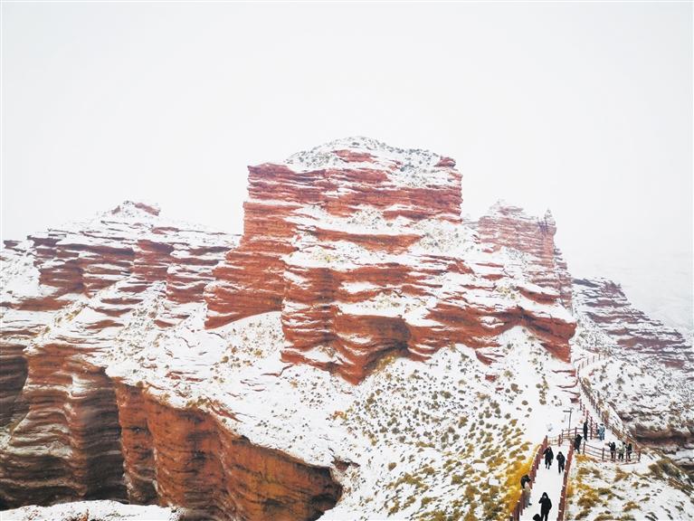 游客在景區(qū)觀景臺上伸手可觸摸到被白雪覆蓋的火紅色彩,峽谷內(nèi),山倚壁蜿蜒,峰隨地勢崢嶸,石林犬牙交錯,游客不時發(fā)出由衷的贊嘆,眼前的風光如仙境一般。