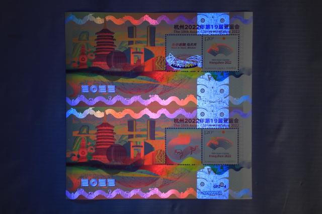 據(jù)了解,《杭州2022年第19屆亞運(yùn)會(huì)》特殊版式個(gè)性化郵票雙連張是中國(guó)集郵有限公司匠心打造的首款GPZ編號(hào)體育題材郵票,由青年設(shè)計(jì)師趙郁竹擔(dān)綱設(shè)計(jì),限量發(fā)行。它依托杭州亞運(yùn)會(huì)色彩系統(tǒng)和視覺形象元素,融歷史文化、現(xiàn)代美學(xué)和未來(lái)暢想于一體,集藝術(shù)感、科技感和運(yùn)動(dòng)感于一身,展現(xiàn)中華文明、浙江風(fēng)采、杭州韻味和時(shí)代魅力,采用特殊版式、編號(hào)和工藝,紫光燈下局部呈現(xiàn)無(wú)色熒光油墨圖案和全真彩效果,傳遞中國(guó)郵政對(duì)杭州亞運(yùn)的美好祝福。(圖片由人民日?qǐng)?bào)客戶端提供)