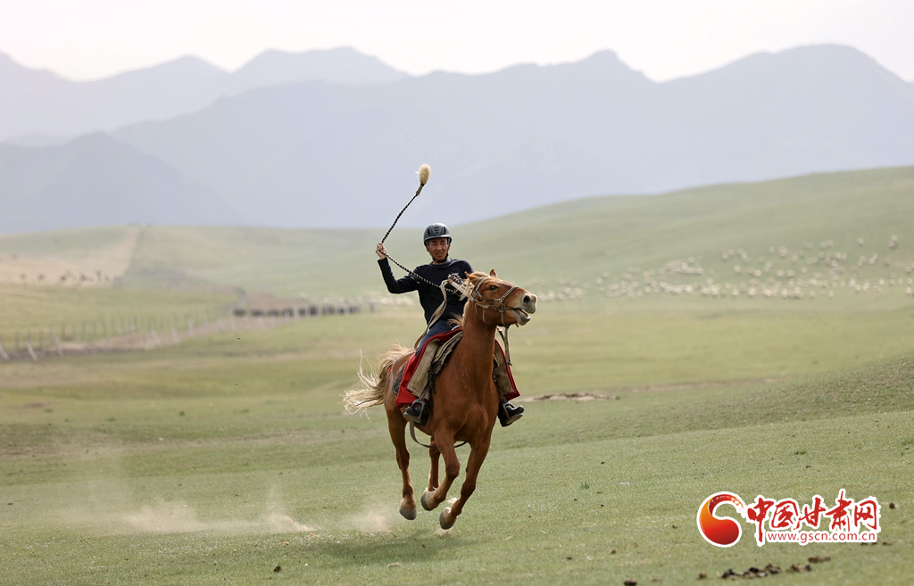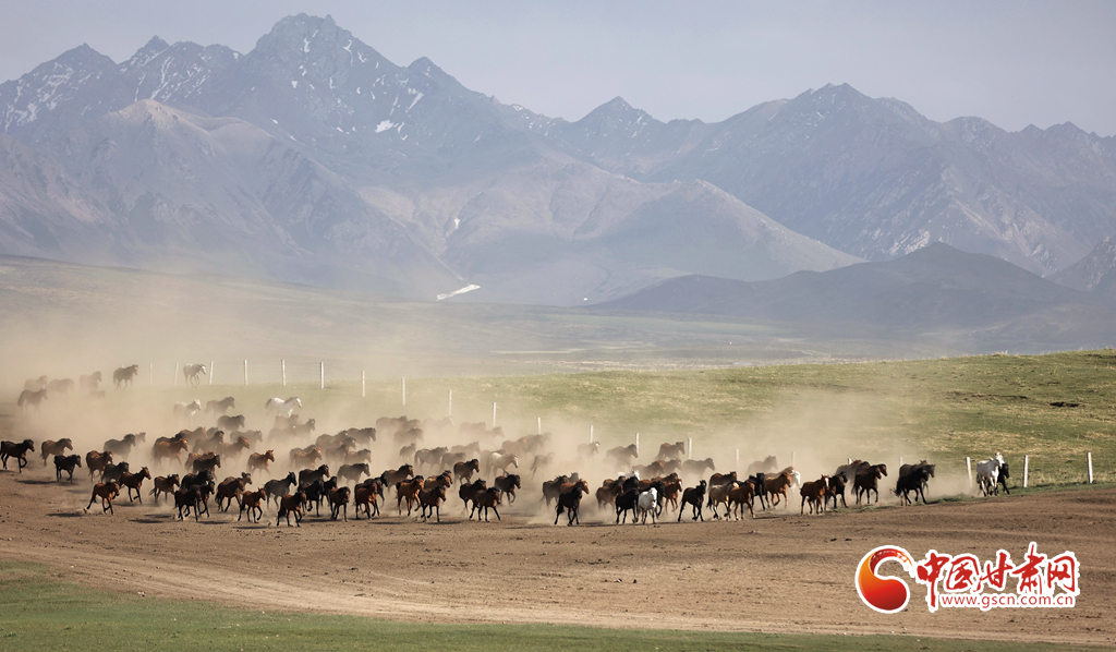 夏日,位于祁連山北麓的甘肅張掖山丹馬場綠草如茵,牧馬人揚鞭催馬,山丹馬場再現(xiàn)萬馬奔騰景象。
