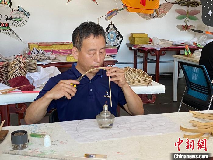 第什里風(fēng)箏第五代傳承人趙艷強(qiáng)正在烤制竹條。李玉素 攝