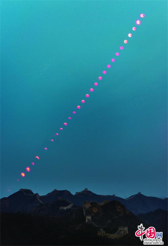 11月8日,月全食(紅月亮)天象驚艷亮相金山嶺長城。(紀正權 張愛東