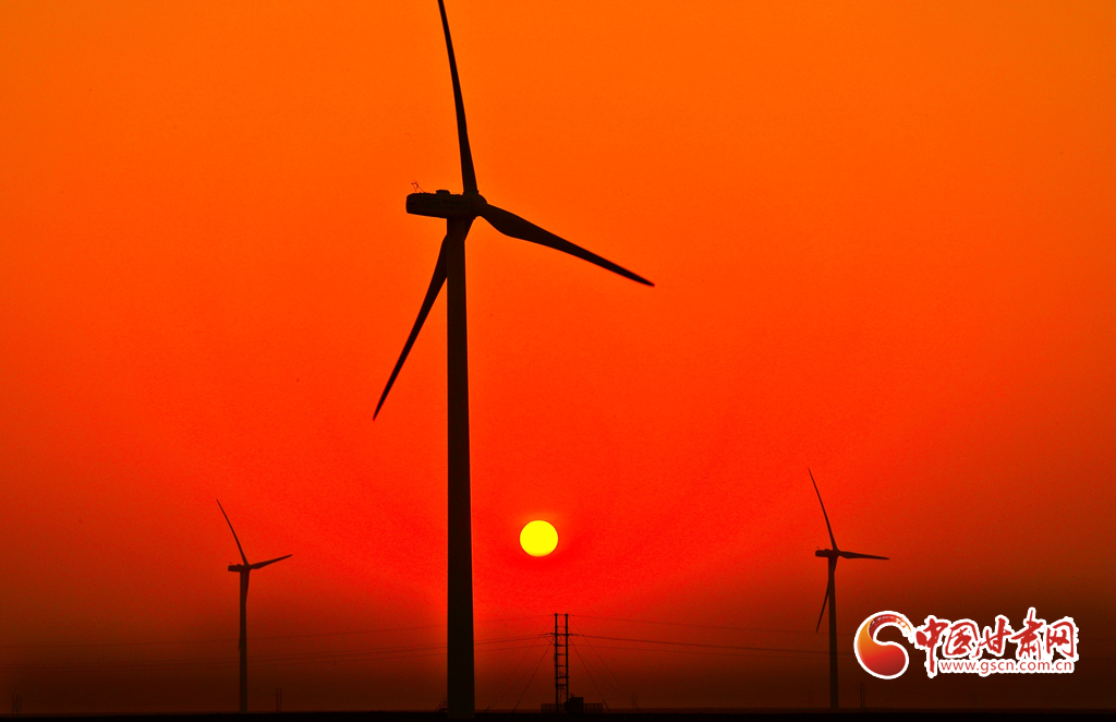 11月17日,甘肅省張掖市甘州區(qū)平山湖蒙古族鄉(xiāng)的草原上,龍?jiān)措娏Ω拭C平山湖風(fēng)電場(chǎng)66臺(tái)風(fēng)電機(jī)組高高聳立,碩大的風(fēng)輪迎風(fēng)不息,與晚霞相映成景。