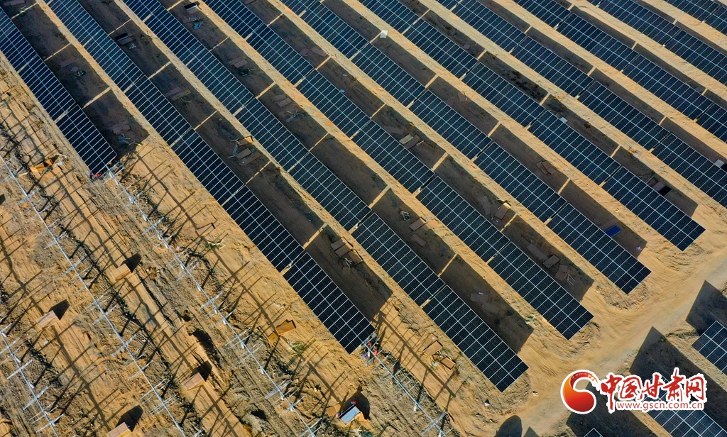 11月17日,甘肅省張掖市甘州區(qū)南灘中能綠電南灘30萬(wàn)千瓦光伏建設(shè)現(xiàn)場(chǎng),工人們正在安裝光伏板。