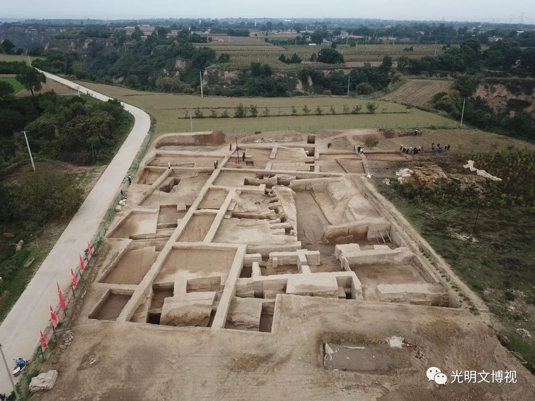甘肅慶陽西峰西郊的南佐遺址,坐落在黃土高原第一大塬——董志塬上,傳說中這里是黃帝部族的重要活動地域,也是以農業(yè)著稱的周人祖先不窋?shù)睦霞摇D献暨z址發(fā)現(xiàn)于1958年,1984—1986年和1994—1996年有過兩個階段的發(fā)掘,從2021年開始第三階段的發(fā)掘和調查、勘探工作,基本確認這是一處以仰韶文化晚期大型聚落為主體的遺址,遺址面積在600萬平方米以上,可能有外環(huán)壕。聚落中部是由9座方形夯土臺及其環(huán)壕圍成的面積約30萬平方米的核心區(qū),核心區(qū)中部偏北是數(shù)千平方米的由“護城河”和夯土宮墻圍成的“宮城”。“宮城”中心為主殿,“九臺”之外還有多處居住區(qū)、夯土臺、溝渠水利設施等遺存,出土了大量白陶、黑陶等珍貴遺物和大量水稻,從多個方面顯現(xiàn)出早期國家和文明社會的氣象。