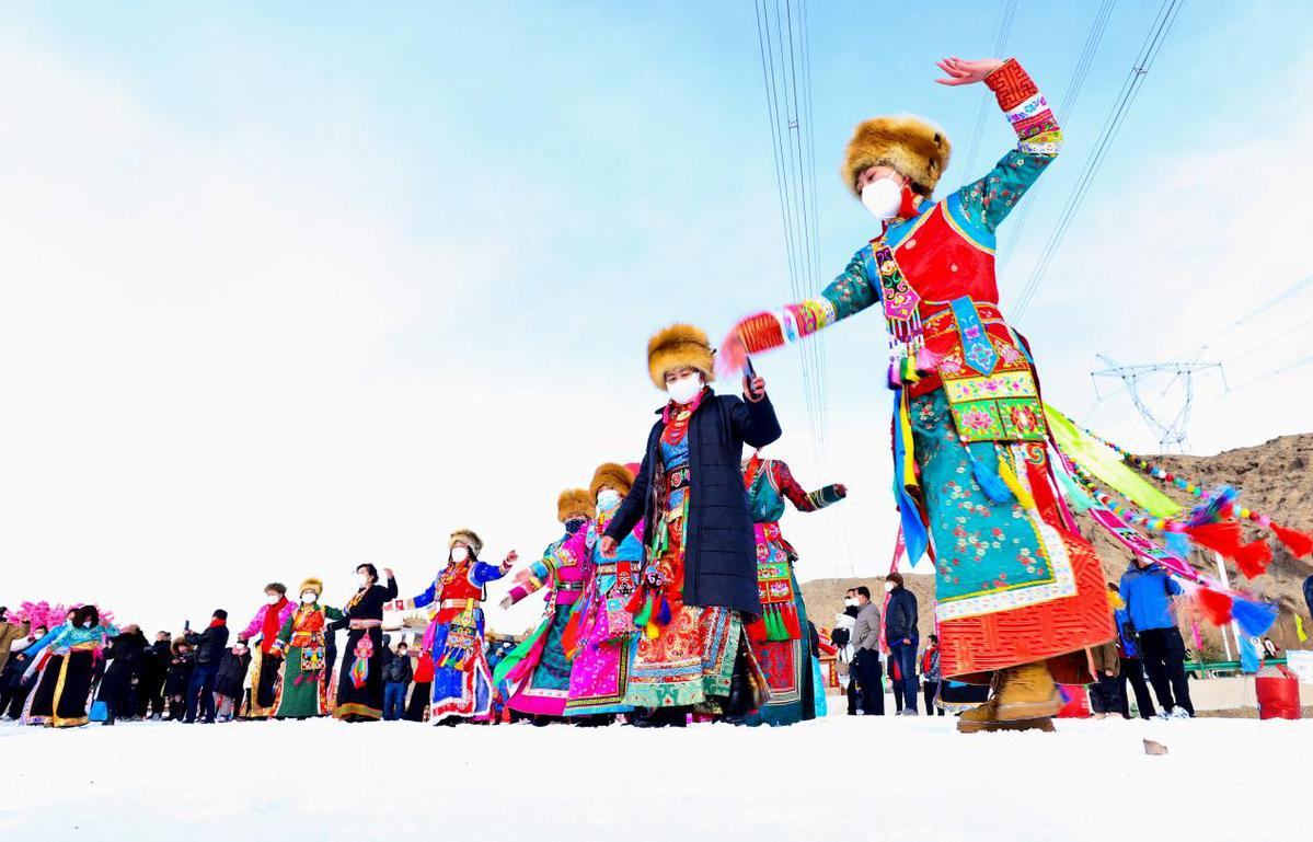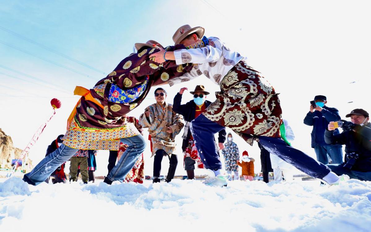 當(dāng)日,“相約文殊山樂享冰雪趣”,藏族群眾在冰雪運(yùn)動(dòng)場(chǎng)上進(jìn)行雪地鍋莊舞、頂杠子、拔棍、拉爬牛、戶外徒步、雪地摔跤、雪圈滑行追逐、滑冰、電商直播等多項(xiàng)比賽,吸引了周邊群眾和甘肅酒泉、嘉峪關(guān)等地的萬名游客前來參觀游覽和參與比賽。