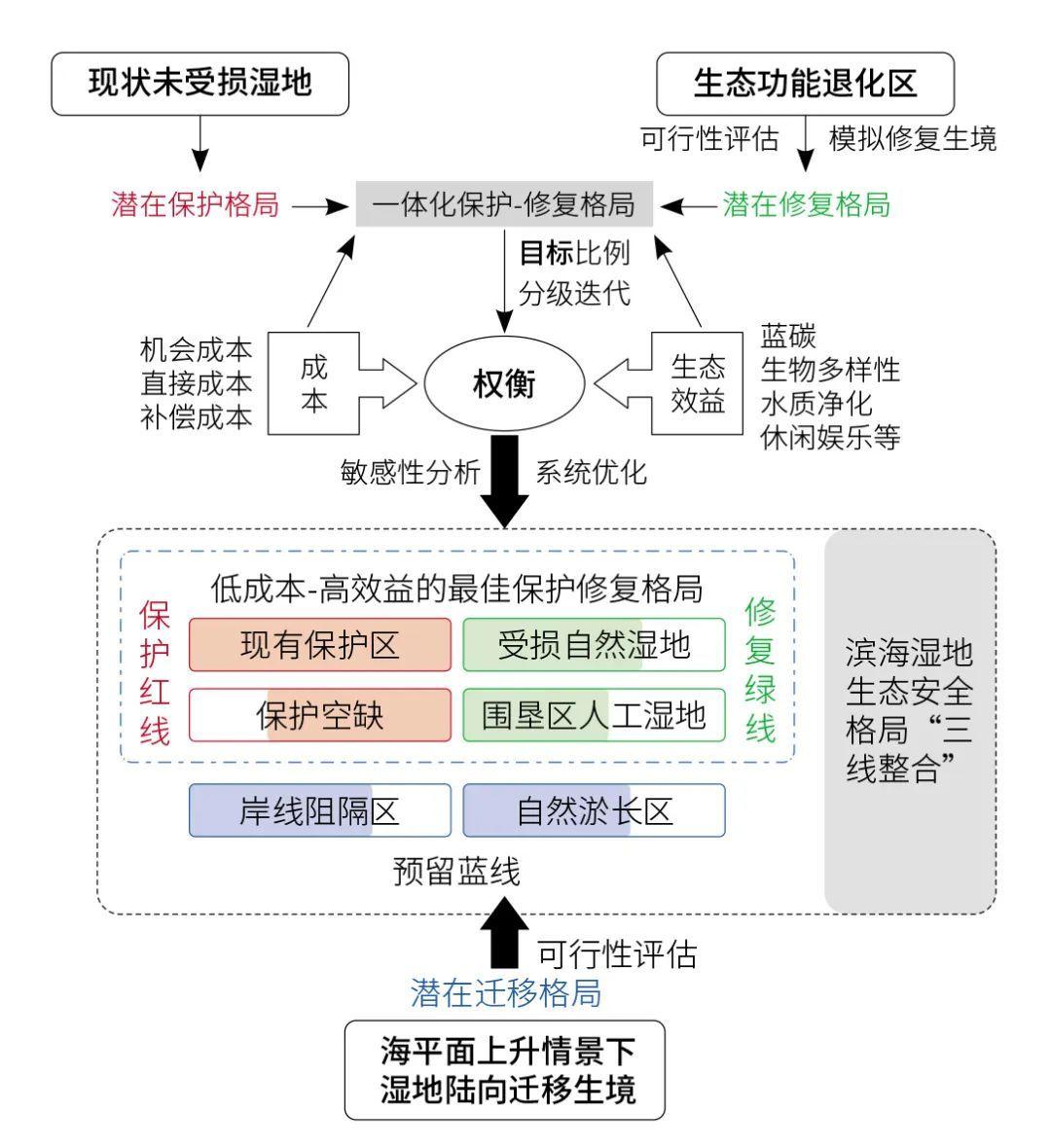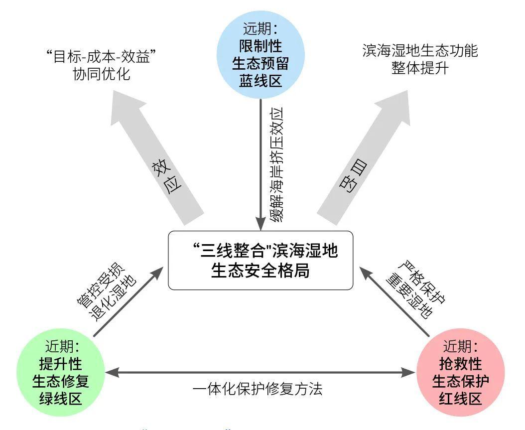 其概念構架強調一體化整合保護與修復格局,同時兼顧濱海濕地應對海平面上升的長期適應性,構建對濱海生態(tài)系統(tǒng)整體功能提升最惠益的生態(tài)安全格局,包括:近期搶救性生態(tài)保護紅線區(qū)與提升性生態(tài)修復綠線區(qū),以及遠期限制性生態(tài)預留藍線區(qū),由此構建應對圍墾開發(fā)和適應未來海平面上升情形下,基于“三線整合”的濱海濕地生態(tài)安全格局(圖1)。