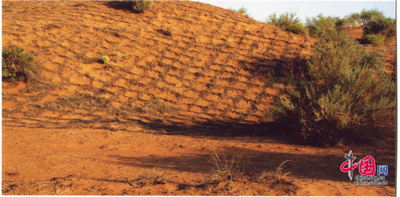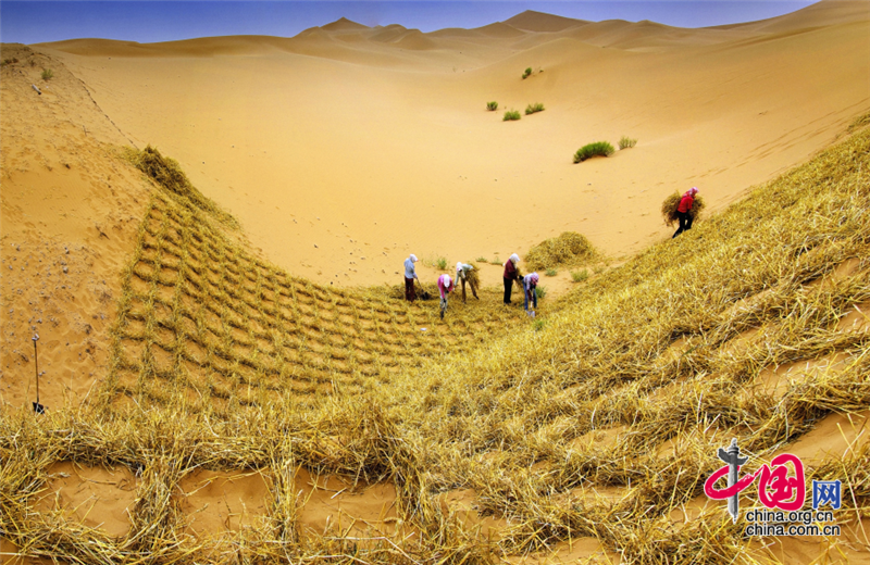 小小的“麥草方格”不僅阻止了流沙,防止了荒漠化,還加速了當(dāng)?shù)亟?jīng)濟(jì)的發(fā)展。“麥草方格”固沙法即:將廢棄的麥草呈方格狀鋪在沙面上,然后用鐵鍬軋進(jìn)沙中,留麥草的三分之一或一半立在四周,并在方格中植入治沙人經(jīng)九次試驗成功培育出的花棒、檸條等沙生植物,腐爛干枯的麥草還作為肥料滋養(yǎng)植物的生長。