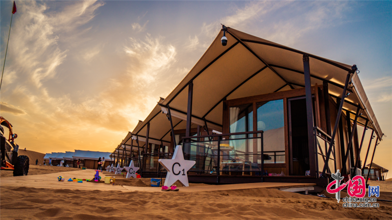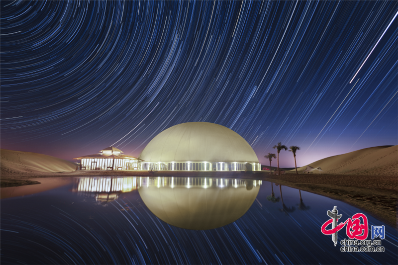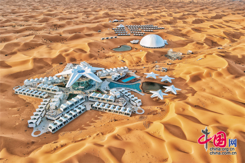 沙坡頭旅游區(qū)依托良好的生態(tài)資源,打造了國內(nèi)首個以沙漠觀星為主題打造的酒店——星星酒店,在蒼茫遼闊的沙漠之中,這座造型獨特的酒店仿佛星星一般,閃爍其中。