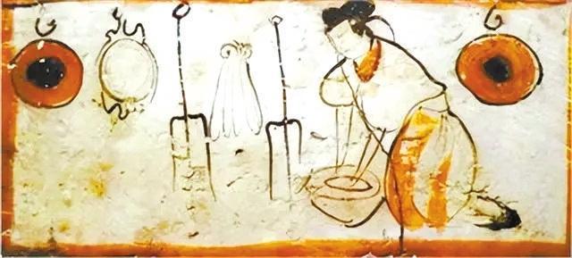 嘉峪關(guān)新城三號墓曾出土一塊畫像磚,圖為女子在盆中揉面,后面的墻上掛著鐺、箕等廚具。