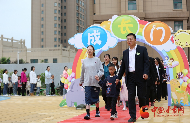 一年級(jí)新生在老師和家長的陪伴下走過“成長門”