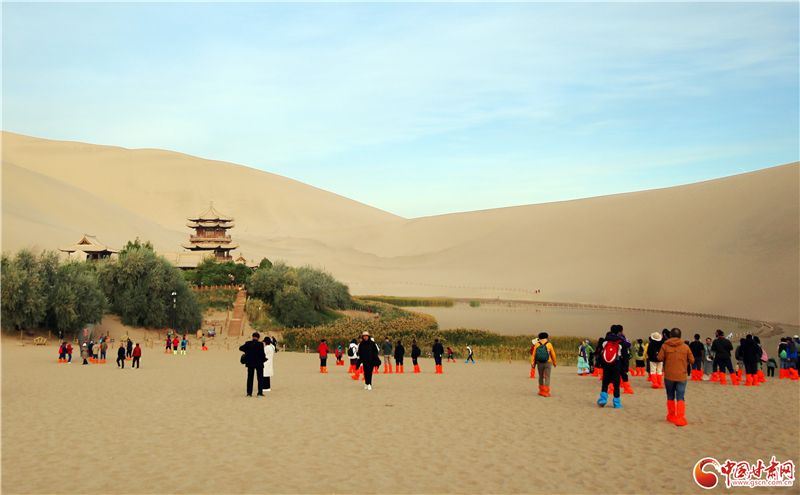 鳴沙山以沙動成響而得名,峰巒危峭,山脊如刃。最早在東漢辛氏《三秦記》中有“河西有沙角山,峰崿危峻,逾于石山,其沙粒粗色黃,有如乾糒……人欲登峰,必步下入穴,即有鼓角之聲,震動人足”的記載。而月牙泉是環(huán)抱在鳴沙山中的一灣清泉,形如玄月,故名“月牙泉”,并形成了鳴沙山月牙泉景區(qū),被譽為“塞外風光之一絕”。