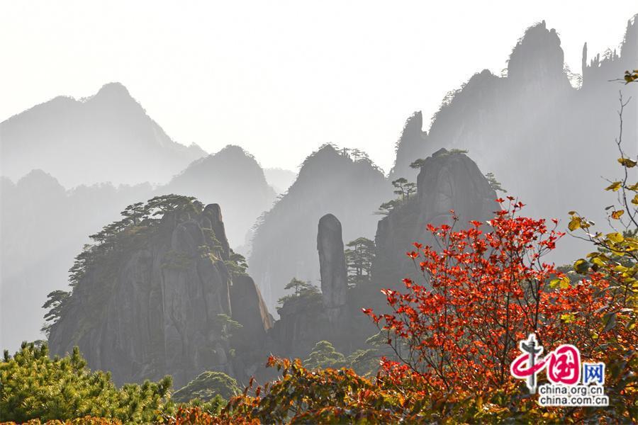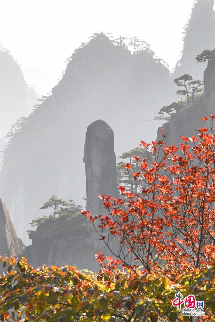 秋日黃山,雨后放晴最為嫵媚。蔚藍(lán)色的天空一塵不染,山間綿連不斷的云海,時(shí)而像海浪在空中翻滾,擁擠著、碰撞著,時(shí)而像一匹白紗綢緞,環(huán)繞在山巔上、飄散在松林間,只見(jiàn)黃山的紅葉點(diǎn)點(diǎn)散落,紅綠相間,與峻峭山峰、藍(lán)天云海、奇松怪石,精致婉約地繪成一幅幅五顏六色的山林畫(huà)卷,正是登游好時(shí)節(jié)。(姚育青)