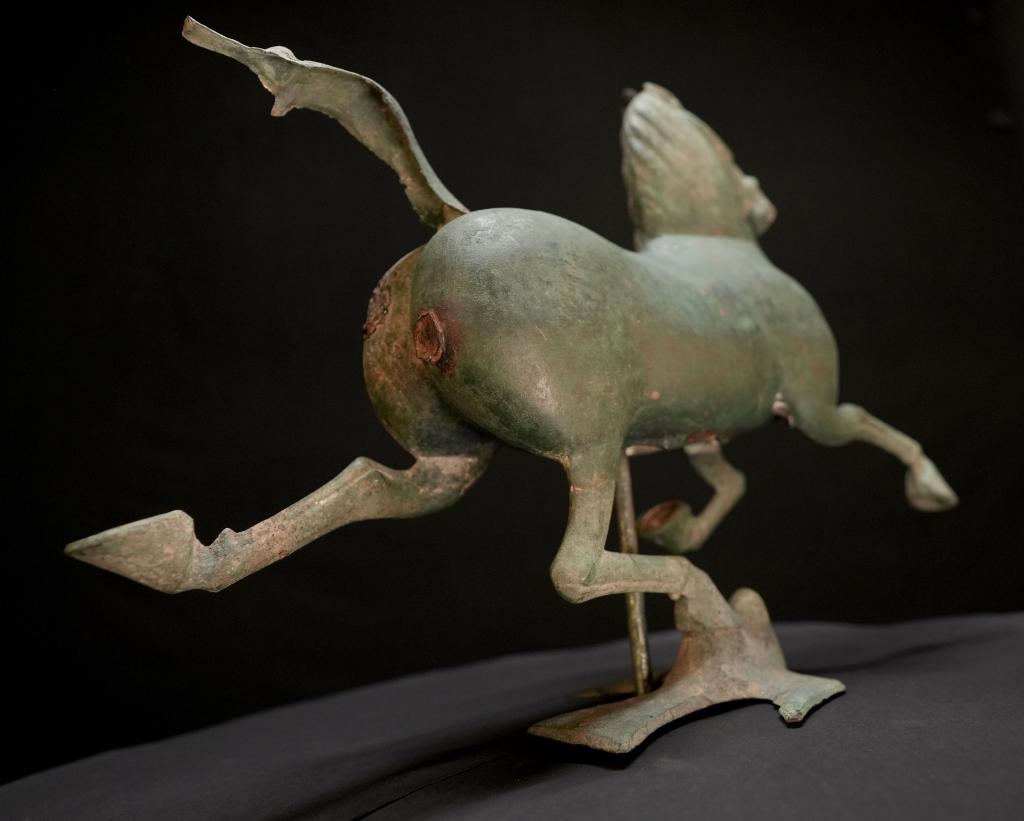 馬兒如在空中飛馳,一足踏上飛鳥的剎那,飛鳥回首驚顧。細細觀之,馬的口、眼、鼻均張開,鬃毛和尾絲后揚,令人仿若聽見馬兒奔騰的嘶鳴和風嘯聲,靜態(tài)的青銅器充滿靈動之感。