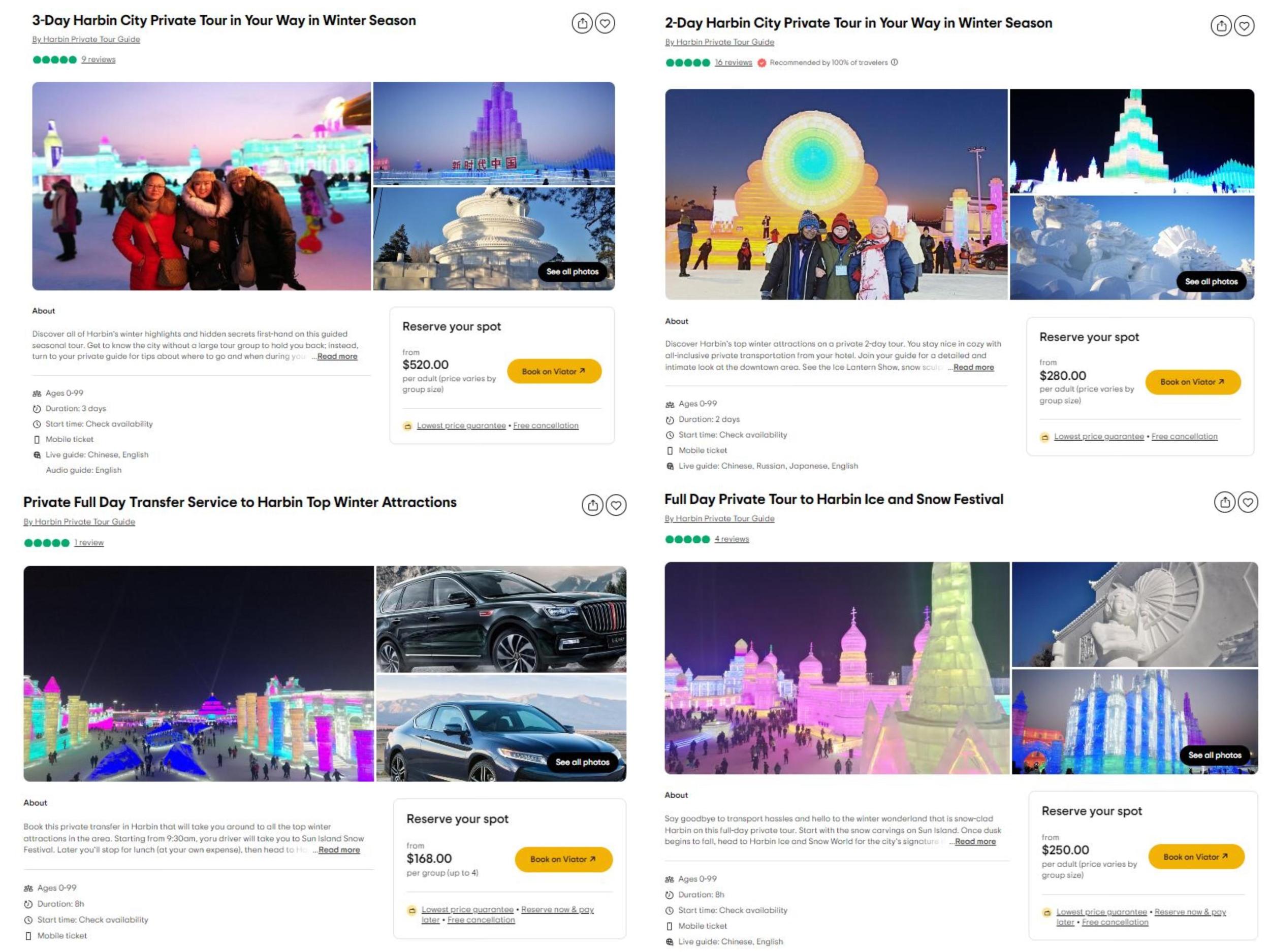 中新財經(jīng)查看Tripadvisor網(wǎng)站發(fā)現(xiàn),該平臺上有數(shù)十個關(guān)于哈爾濱旅游的服務(wù)。其中,“哈爾濱市冬季私人三日游”每位成人收費520美元起,“哈爾濱市冬季私人兩日游”每位成人收費280美元起,這兩個服務(wù)的費用不包括門票,包括私人導(dǎo)游服務(wù)、交通費(私人汽車或公交車/出租車)、酒店接送;“哈爾濱冬季熱門景點私人全日接送”每團收費168美元起(最多4人),費用不包括門票等,包括私人汽車、私人司機服務(wù)、燃油附加費。