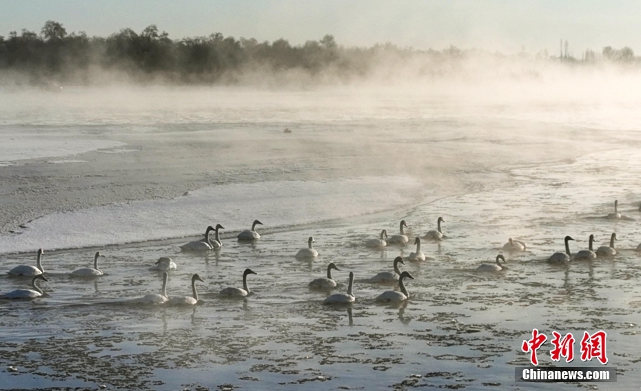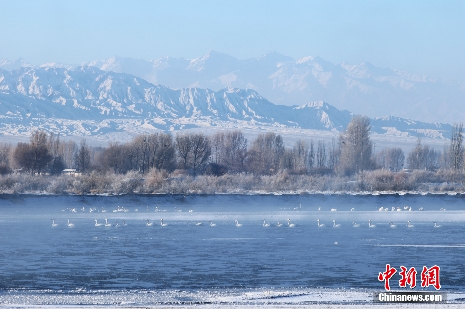 1月21日清晨,甘肅張掖市黑河國家級自然保護區(qū),受低溫影響,黑河水面霧氣氤氳縹緲,天鵝在水中暢游,野鴨等候鳥在空中飛舞,宛如一幅水墨生態(tài)畫卷。圖/CNSphoto 成 林 攝
