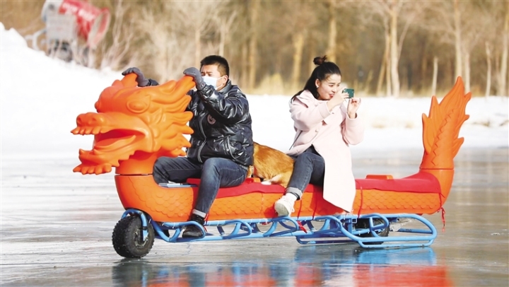 游客在金塔沙漠胡楊林冰雪嘉年華項(xiàng)目娛樂區(qū)游玩。魏 丹 攝