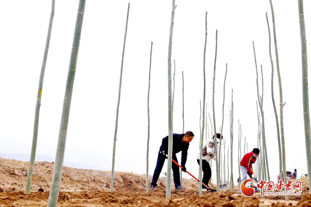 4月9日,甘肅省張掖市甘州區(qū)三閘鎮(zhèn)高寨村義務(wù)植樹基地上,千名當(dāng)?shù)馗刹柯毠ず椭驹刚邆儞]鍬鏟土挖樹坑,掀起農(nóng)田防護林建設(shè)和防沙治沙春季植樹造林熱潮。