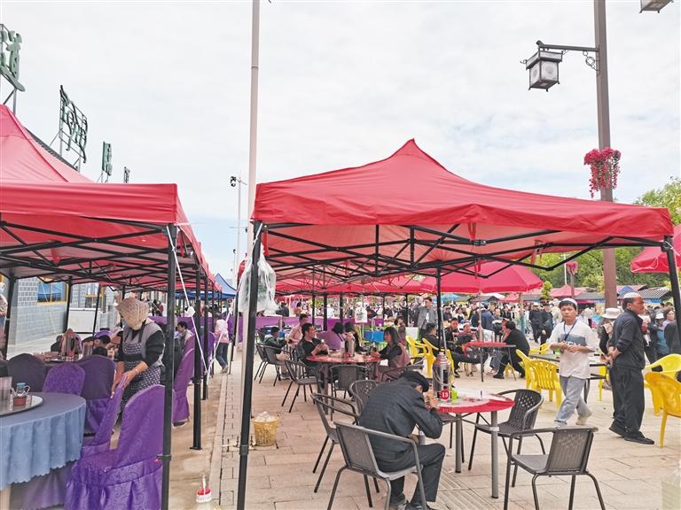 每一個(gè)攤點(diǎn)前,坐滿了游客,他們吃著手抓羊肉、釀皮等特色美食,看著花兒會(huì)文藝演出,好不愜意。
