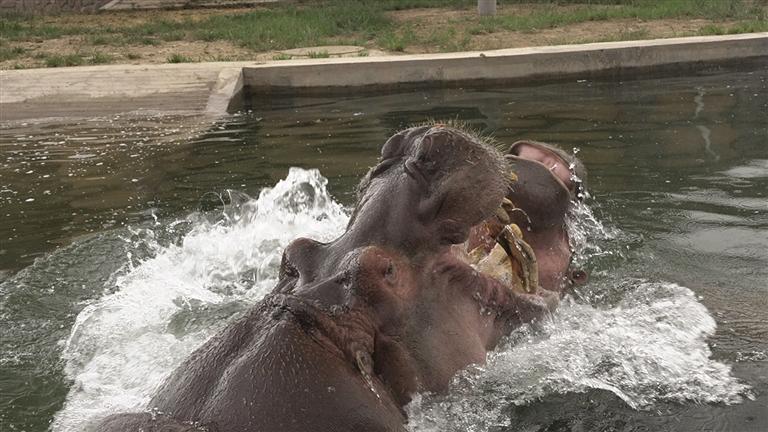 “小乖”今年正值青春活潑的年紀,性格溫順可愛。經過一段時間的精心準備與適應期,“小乖”已經與老住戶“大嘴”和諧相處,一同在水中暢游、嬉戲玩耍,或是在岸邊悠閑進食、曬著太陽。兩只河馬的互動與陪伴,給園區(qū)增加了許多樂趣,也給游客們帶來更加新奇、歡樂的觀賞體驗。