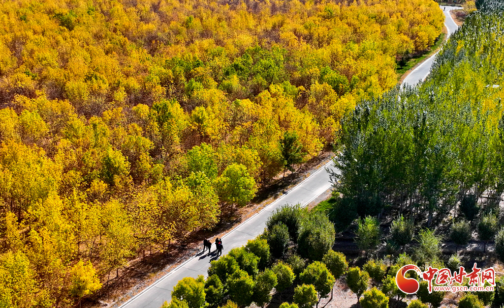 金秋時(shí)節(jié),張掖市甘州區(qū)的黑河兩岸,生態(tài)防護(hù)林的樹葉逐漸披上金色與紅色,景色迷人。尤其是那延綿的人工胡楊林景區(qū),金黃一片,層巒疊嶂,美不勝收。蘭新高鐵與連霍高速穿梭于這片林海之中,構(gòu)成了一幅動(dòng)人的風(fēng)景線。這里的空氣純凈、環(huán)境寧靜、負(fù)氧離子含量豐富,成為了游客和市民休閑觀光的理想之地。