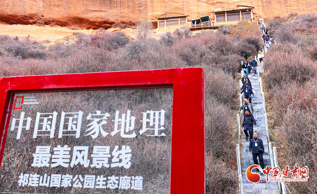 11月9日,甘肅省張掖市肅南裕固族自治縣馬蹄生態(tài)文化旅游景區(qū)金塔寺石窟內(nèi),甘肅百家旅行社的導(dǎo)游們正在仔細(xì)觀賞千年石窟。