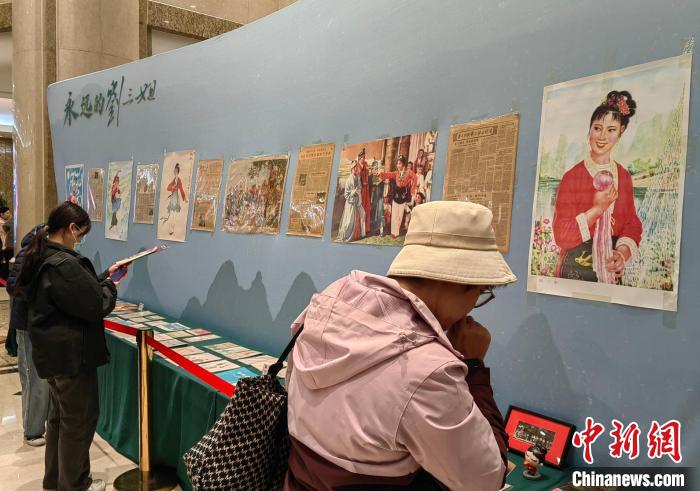 “永遠(yuǎn)的劉三姐”小型展覽18日晚也在長(zhǎng)安大戲院展出,各種版本《劉三姐》的劇本、歌本、歌片、節(jié)目單,與劉三姐相關(guān)的各種海報(bào)、唱片、郵品和老報(bào)紙等展品吸引觀眾紛紛駐足。