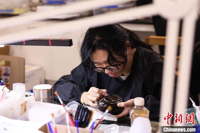 江西省文物考古研究院的丁金果也是“00后”,且參與了新展出漆器的修復(fù)。她表示,?;韬钅钩鐾恋钠崞髟谒薪萘嗽S久,大多數(shù)漆器已經(jīng)嚴重變形、破碎。經(jīng)過清洗、脫水、矯形、粘接、髹漆等諸多步驟,這些漆器便能再現(xiàn)原貌,但也需要大量的時間去修復(fù)。