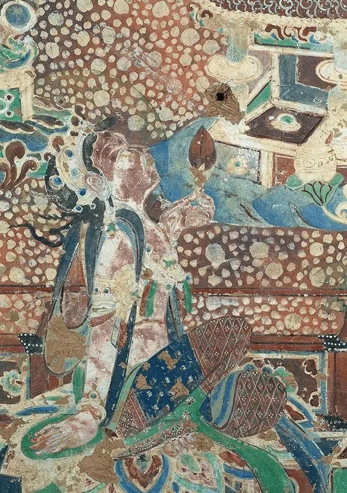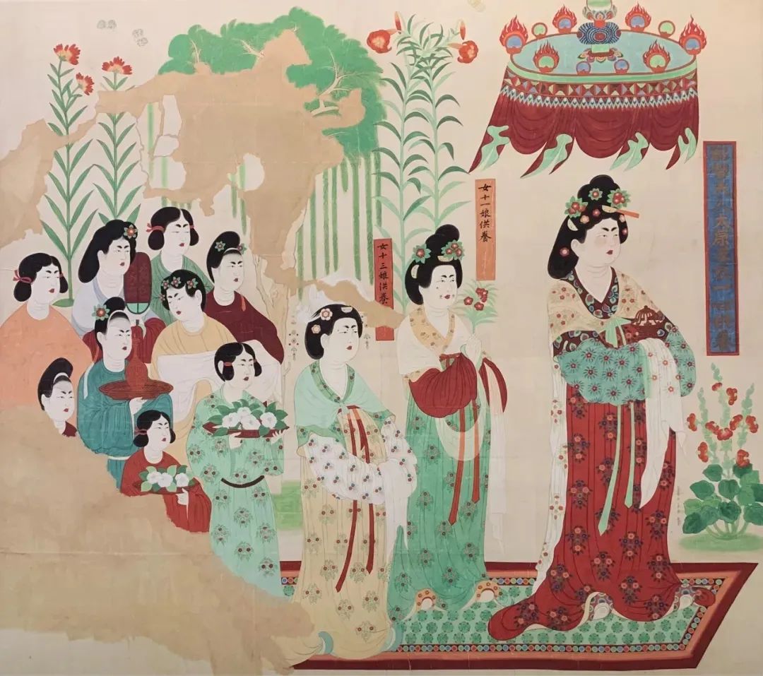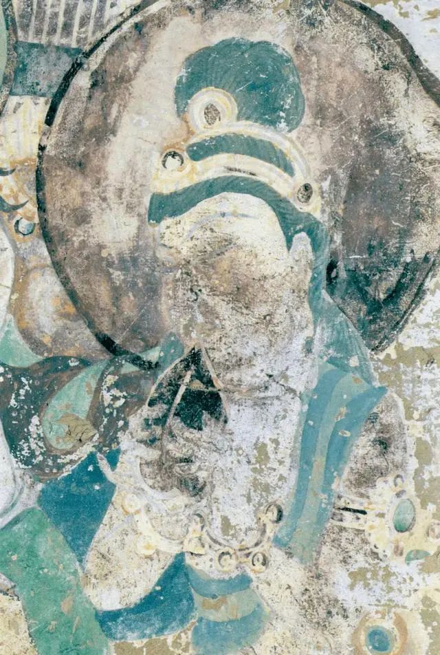 (2)莫高窟第130窟飛天壁畫修復當我在第161窟修復壁畫時,突然聽到洞窟外一聲巨響,我猜想,應該是洞窟發(fā)生了坍塌。于是我趕緊循聲而去,發(fā)現(xiàn)發(fā)出巨大聲響的是第130窟,第130窟北壁上部壁畫為飛天,其中空鼓壁畫大面積脫落,有2平方米多。脫落的壁畫掉在了佛腳上,碎成了一地。未脫落壁畫的邊緣十幾厘米都已脫離墻壁,隨時有脫落的風險。我于是向常書鴻先生匯報,然后我們上報國家文化部。國家文化部批示,對第130窟進行加固維修。