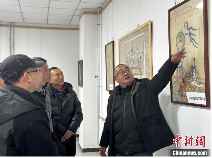 12月17日,由蘭州市七里河區(qū)委宣傳部、七里河區(qū)文體旅局聯(lián)合舉辦的“大漠孤陽(yáng)映彩霞 敦煌神韻美如畫(huà)”新時(shí)代文明實(shí)踐主題活動(dòng)暨敦煌巖彩畫(huà)書(shū)畫(huà)藝術(shù)展拉開(kāi)帷幕。圖為展覽組織者為參觀(guān)者講解展出的作品。楊娜 攝