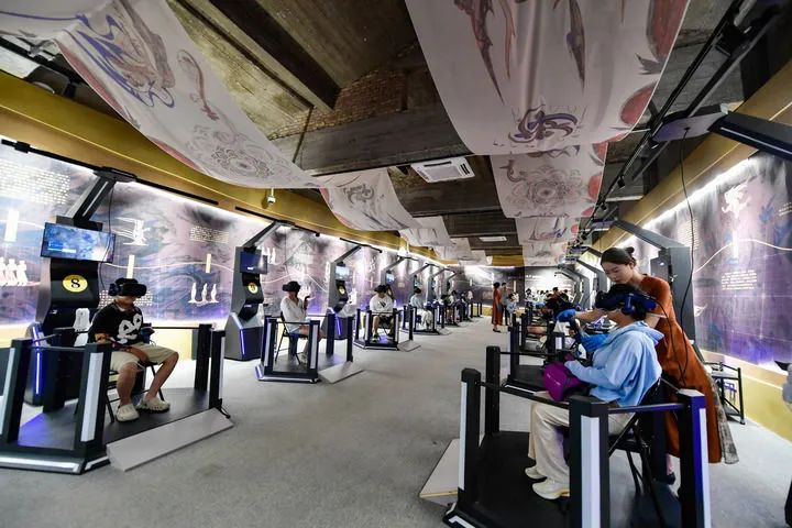 2024年7月22日,游客在敦煌體驗“尋境敦煌——數(shù)字敦煌沉浸展”。新華社記者 郎兵兵 攝