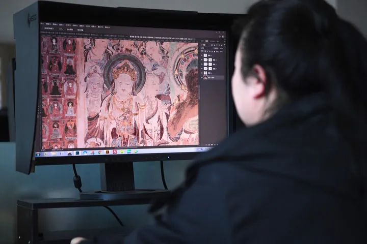 2023年4月25日,敦煌研究院文物數(shù)字化保護團隊圖像處理人員年海麗在拼接壁畫圖像。新華社記者 陳斌 攝