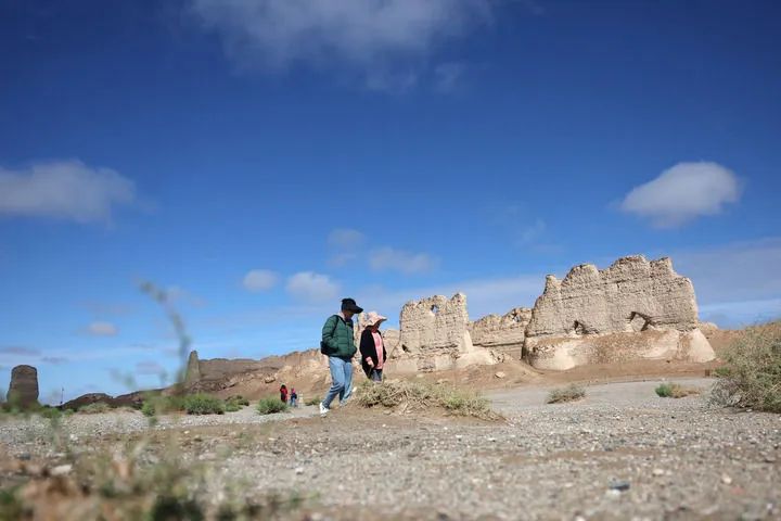 2024年9月4日,游客在雨后的玉門關(guān)遺址區(qū)大方盤城游覽。新華社記者 陳斌 攝