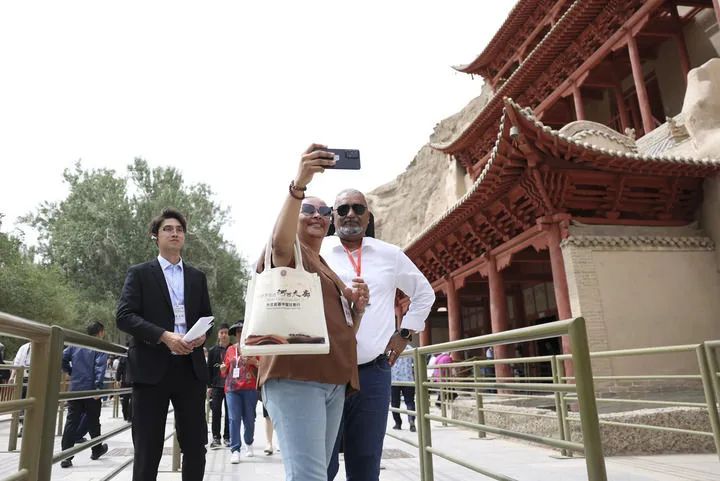 2024年6月7日,前來甘肅調(diào)研考察的駐華外交官在敦煌莫高窟九層樓前留影。新華社記者 陳斌 攝