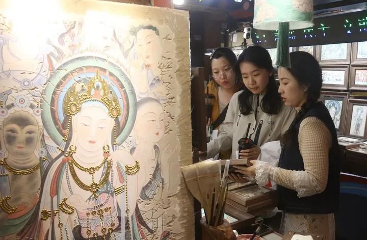 街道上,獨具特色的文化元素?zé)o處不在。民宿老板用改良的“三兔共耳”紋樣裝飾門楣,茶館的八棱柱竟是莫高窟中心塔柱的微縮版。最多的還是書店和文創(chuàng)店,一家挨著一家,紅柳根雕、敦煌樂器、創(chuàng)意工美、飛天泥版畫琳瑯滿目。