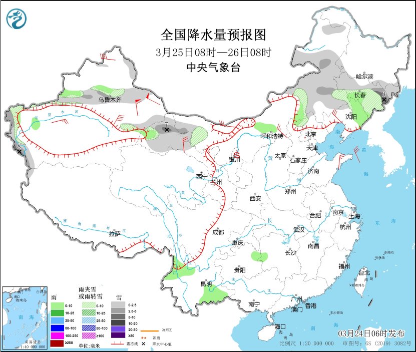 3月25日08時至26日08時,新疆沿天山地區(qū)、內(nèi)蒙古西北部和東部、吉林大部、甘肅河西等地部分地區(qū)有小到中雪或雨夾雪,其中,吉林東部、新疆南疆西部山區(qū)、甘肅北部等地部分地區(qū)有大雪(5~8毫米)。新疆伊犁河谷、內(nèi)蒙古中部、吉林中部、遼寧東部、河北北部、湖南西部、貴州東北部、云南西北部和東南部等地部分地區(qū)有小雨。內(nèi)蒙古中西部、遼寧西部、山東半島、新疆東部、甘肅北部等地部分地區(qū)有4~6級風(fēng),新疆山口地區(qū)陣風(fēng)風(fēng)力8~9級。內(nèi)蒙古中西部、甘肅河西、寧夏等地部分地區(qū)有揚(yáng)沙。
