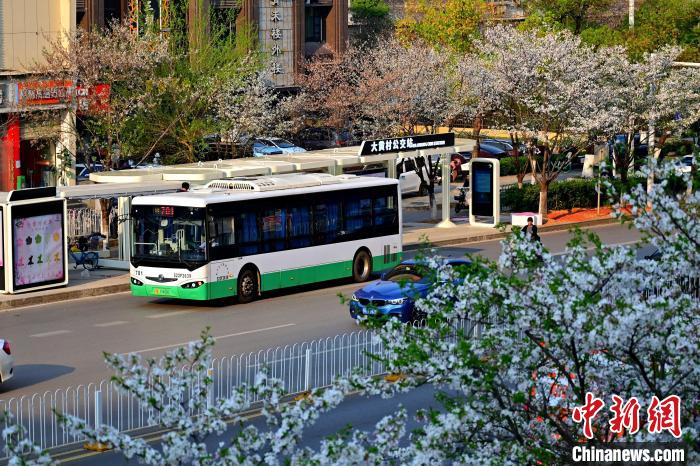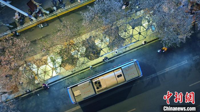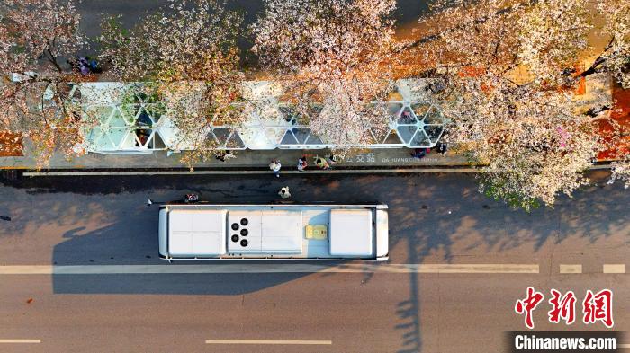 3月26日,被譽(yù)為武漢“最美櫻花車(chē)站”的珞喻東路大黃村公交站櫻花盛放。經(jīng)過(guò)改造的大黃村公交站,新增了自助售貨機(jī)、衛(wèi)生間、共享充電寶等便民設(shè)施,煥然一新的科技智慧站臺(tái)與粉白如霞的櫻花相映生輝。微風(fēng)吹過(guò),櫻花花瓣浪漫飄零,吸引不少市民游客觀賞“打卡”。圖為公交車(chē)在珞喻東路大黃村公交站停留。(無(wú)人機(jī)照片)劉康 攝