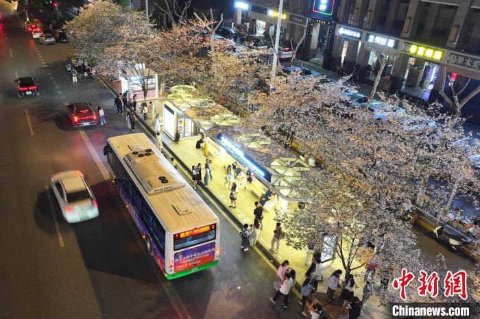 圖為夜間的珞喻東路大黃村公交站,櫻花在光影中呈現(xiàn)別樣魅力。劉康 攝
