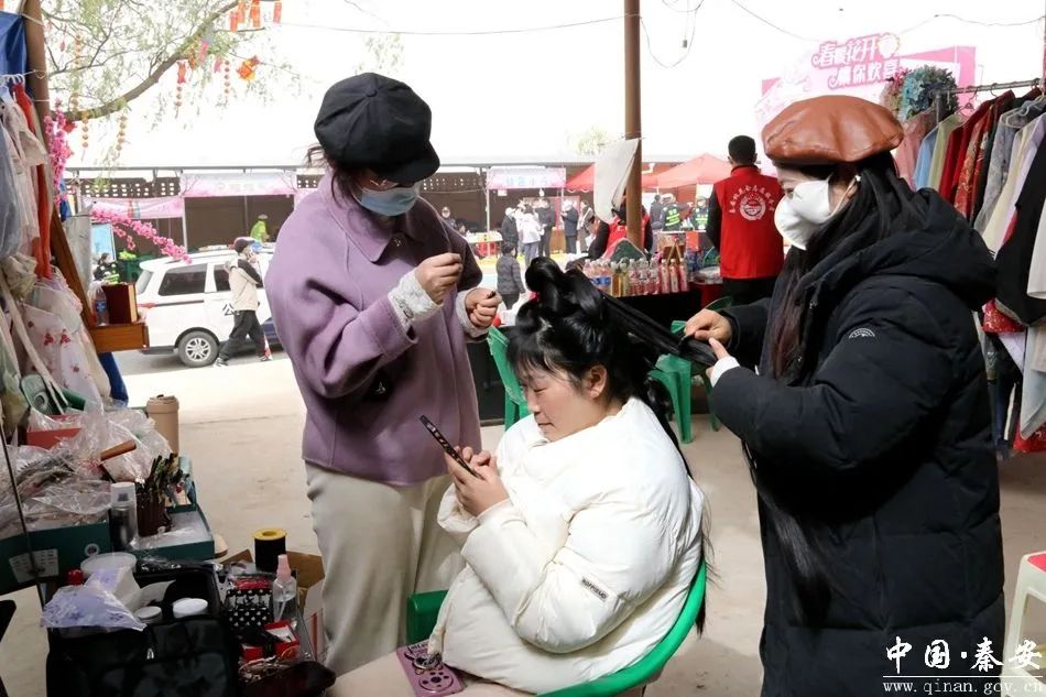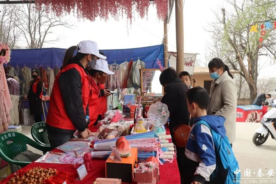 文創(chuàng)攤位前同樣人氣爆棚。精美的桃花折扇、雕花書簽、桃花傘,印著大地灣文化IP“小祖宗”的帆布包,寓意吉祥的桃木雕刻,以及麥稈編、剪紙等非遺手工藝品,每件都承載著秦安文化底蘊(yùn)。攤主熱情地為顧客介紹產(chǎn)品的來(lái)歷與寓意,偶爾還會(huì)講述一些背后的創(chuàng)作背景故事,引得大家頻頻點(diǎn)頭稱贊。
