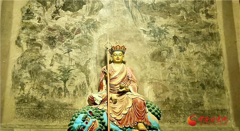 這幅壁畫繪于大佛殿內(nèi)大佛身后墻壁,色彩雖已斑駁,卻仍難掩其藝術(shù)價(jià)值,是大佛殿內(nèi)時(shí)代較早、藝術(shù)水準(zhǔn)極高的作品。它距地面高1.55米,上下兩端用墨線勾出邊欄,邊欄內(nèi)繪纏枝牡丹點(diǎn)綴;《西游記》故事圖居于正中,殘長約4.4米,殘高約2.9米,面積約12.7平方米,壁畫前今塑有地藏王菩薩像一尊。壁畫由“取水子母河”“道昧放心猿”“大戰(zhàn)紅孩兒”等多個(gè)獨(dú)立故事組成,畫面里險(xiǎn)山怪石、古木溪水、云霧火海錯(cuò)落交織,而師徒四人的分工設(shè)定始終清晰:豬八戒挑行李、沙僧牽馬、孫悟空持金箍棒護(hù)送,這份“固定分工”讓豬八戒的勤勞形象貫穿全程。