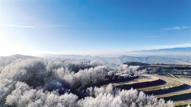 12月17日,一夜寒風(fēng)拂過榆中縣韋營鄉(xiāng),喚醒了千樹萬樹的冰瑩之花。舉目望去,漫山遍野如披輕紗,萬物凝結(jié)成潔白晶瑩的畫卷,移步皆景讓人心曠神怡。