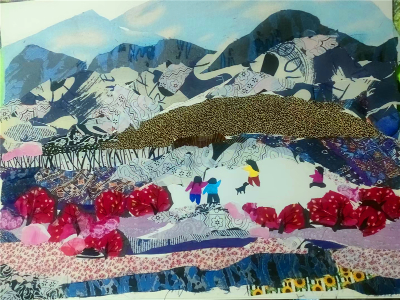 裁剪環(huán)節(jié)更見功力。她以“銳利”之心駕馭剪刀,根據(jù)畫面需求將碎布剪成不同形狀,有的需棱角分明,有的要圓潤柔和。粘貼時(shí),她摒棄簡單的粘合方式,采用傳統(tǒng)縫補(bǔ)與現(xiàn)代鑲嵌相結(jié)合的技法,讓布料與底板緊密貼合,既保證了作品的耐久性,又營造出自然的浮雕感。在《黃土風(fēng)情》布貼畫中,她用層層疊疊的碎布表現(xiàn)黃土高原的溝壑縱橫,用深淺不一的色塊勾勒窯洞的錯(cuò)落有致,指尖翻飛間,碎布頭便有了筋骨與神韻。