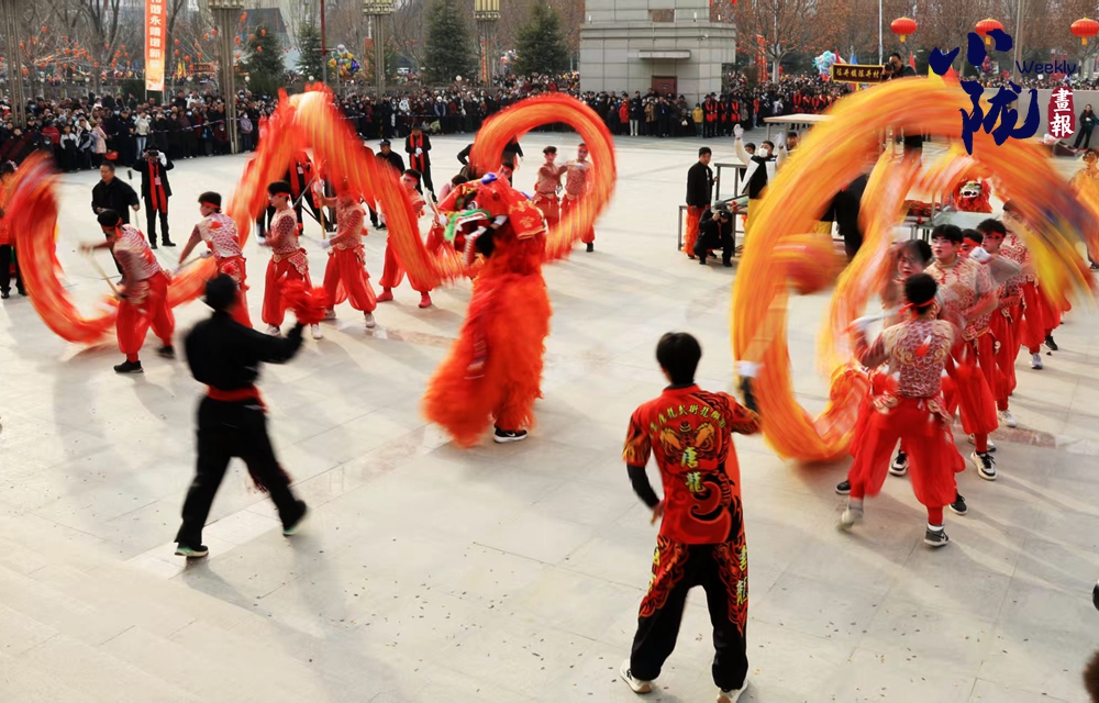 兩條金龍翻江倒海,踏著鼓點(diǎn)蜿蜒游走。舞龍的小伙子們步伐矯健,巨龍在他們的手中時而盤旋昂首,時而穿梭遨游,龍身隨著龍珠上下起伏,氣勢雄武遒勁。