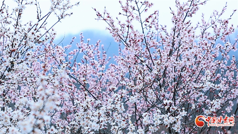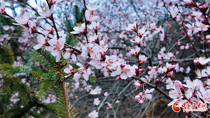桃花朵朵開,如粉色綢帶纏繞在翠綠山間